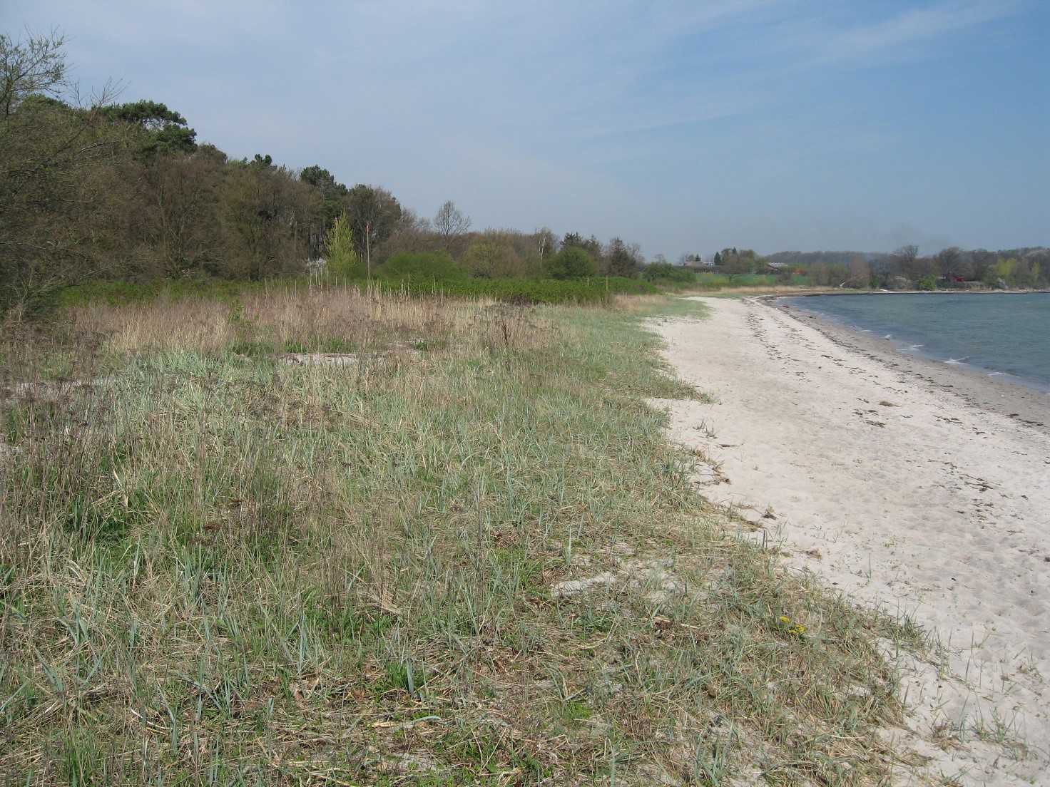 Stranden neden for skoven Tankefuld er meget smal med små sten og nogle stede tagrør og græs helt ned til vandet.